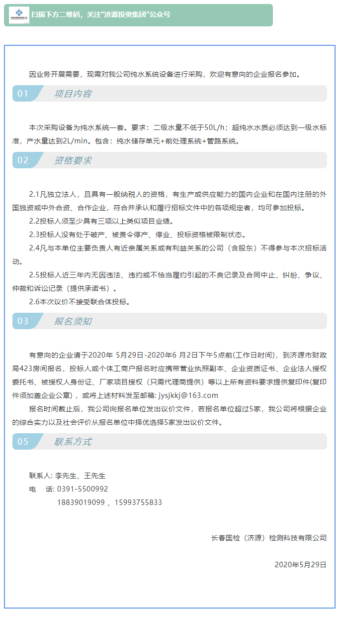 長(zhǎng)春國(guó)檢(濟(jì)源)檢測(cè)科技有限公司采購(gòu)純水系統(tǒng)競(jìng)爭(zhēng)性議價(jià)公告