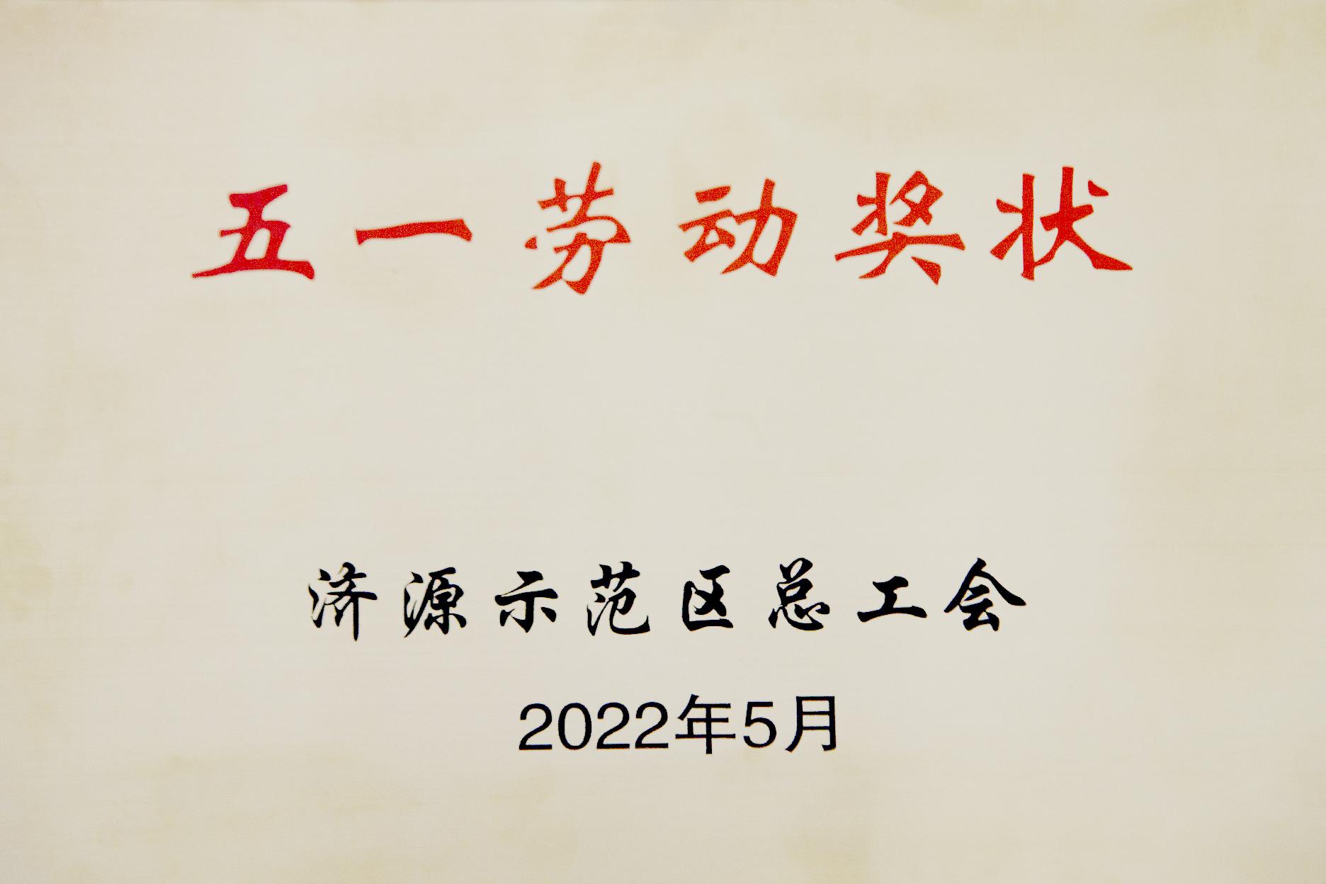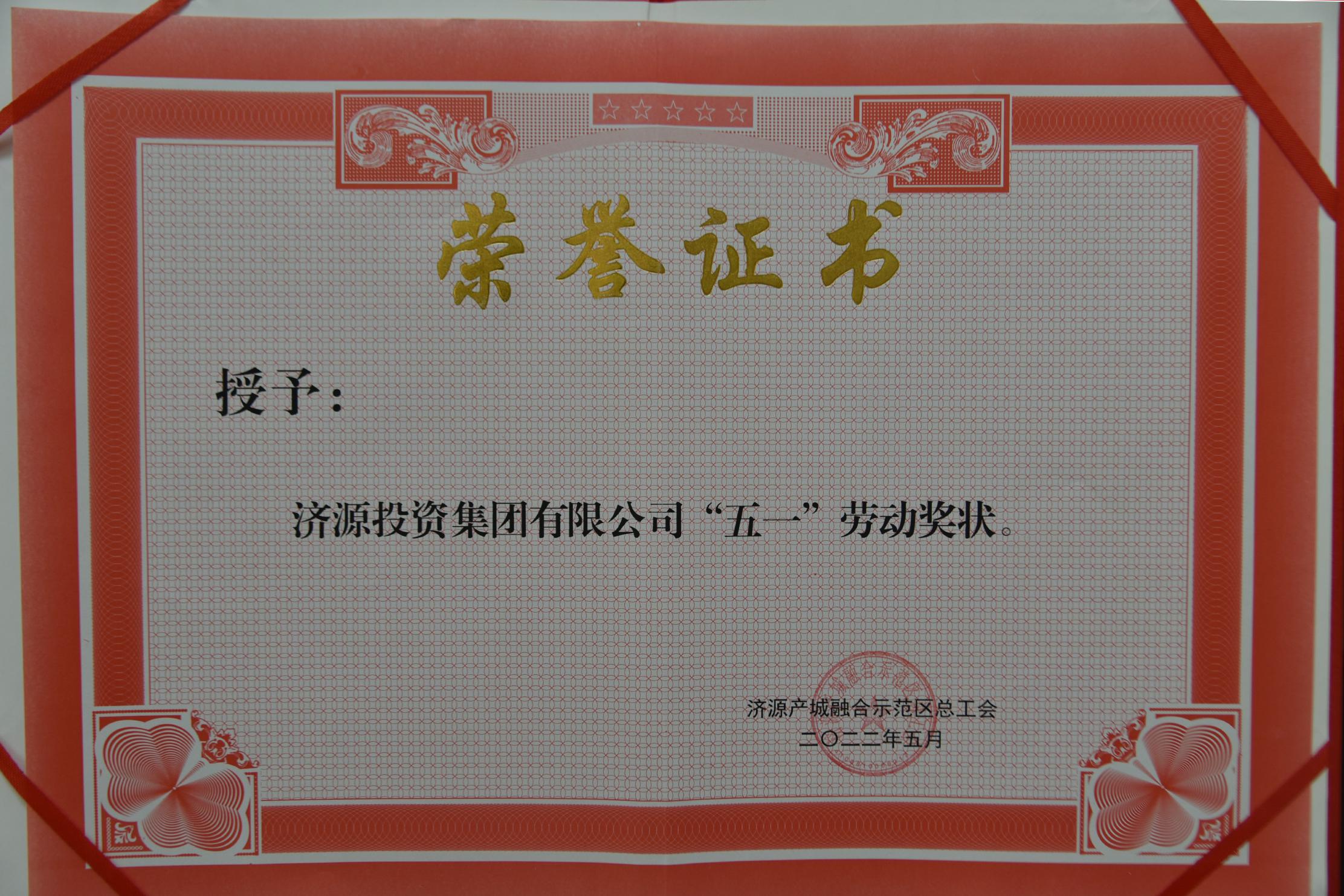5月24日,濟(jì)源示范區(qū)總工會(huì)授予濟(jì)源投資集團(tuán)有限公司“五一勞動(dòng)獎(jiǎng)狀”!