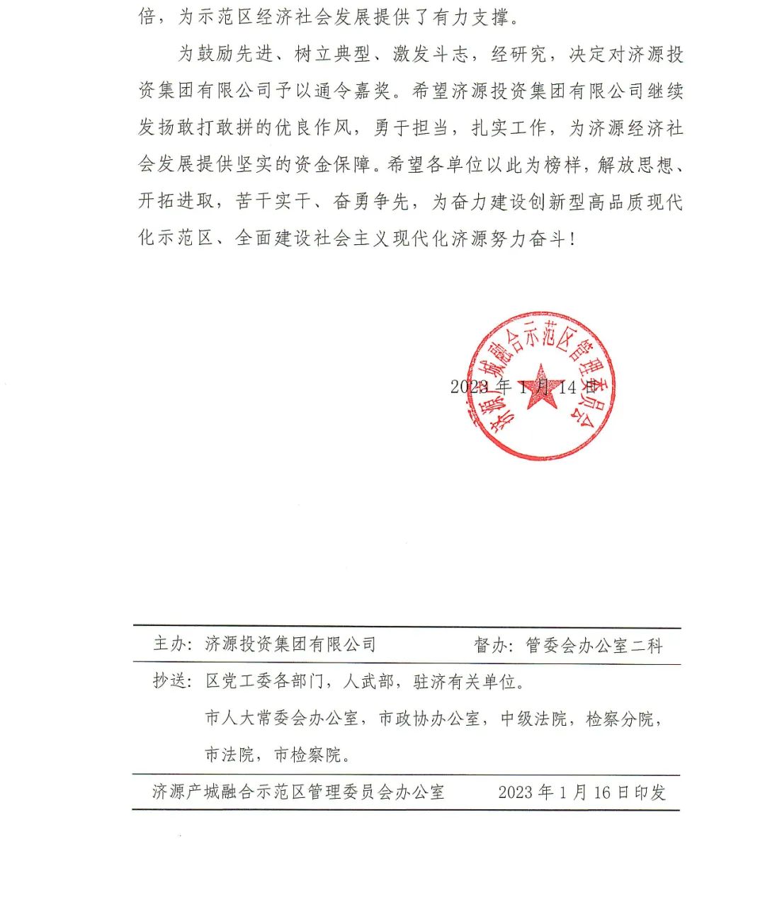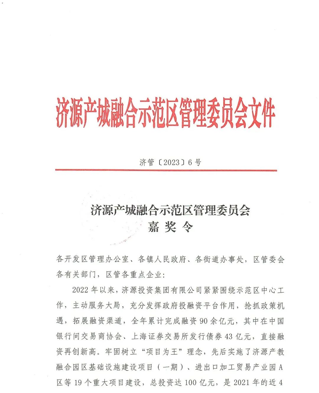 濟(jì)源產(chǎn)城融合示范區(qū)管理委員會(huì)各開(kāi)發(fā)區(qū)管理辦公室、各鎮(zhèn)人民政府、各街道辦事處、區(qū)管委會(huì)各有關(guān)部門(mén)、區(qū)管各重點(diǎn)企業(yè):2022年以來(lái),濟(jì)源投資集團(tuán)有限公司緊緊圍繞示范區(qū)中心工作,主動(dòng)服務(wù)大局,充分發(fā)揮政府投融資平臺(tái)作用,搶抓政策機(jī)遇,拓展融資渠道,全年累計(jì)完成融資90余億元,其中在中國(guó)銀行間交易商協(xié)會(huì)、上海證券交易所發(fā)行債券43億元,直接融資再創(chuàng)新高。牢固樹(shù)立“項(xiàng)目為王”理念,先后實(shí)施了濟(jì)源產(chǎn)教融合園區(qū)基礎(chǔ)設(shè)施建設(shè)項(xiàng)目(一期)、進(jìn)出口加工貿(mào)易產(chǎn)業(yè)園A區(qū)等19個(gè)重大項(xiàng)目建設(shè),總投資達(dá)100億元,是2021年的近4倍,為示范區(qū)經(jīng)濟(jì)社會(huì)發(fā)展提供了有力支撐。? ??為鼓勵(lì)先進(jìn)、樹(shù)立典型、激發(fā)斗志,經(jīng)研究,決定對(duì)濟(jì)源投資集團(tuán)有限公司予以通令嘉獎(jiǎng)。希望濟(jì)源投資集團(tuán)有限公司繼續(xù)發(fā)揚(yáng)敢打敢拼的優(yōu)良作風(fēng),勇于擔(dān)當(dāng),扎實(shí)工作,為濟(jì)源經(jīng)濟(jì)社會(huì)發(fā)展提供堅(jiān)實(shí)的資金保障。希望各單位以此為榜樣,解放思想,開(kāi)拓進(jìn)取,苦干實(shí)干,奮勇?tīng)?zhēng)先,為奮力建設(shè)創(chuàng)新型高品質(zhì)現(xiàn)代化示范區(qū),全面建設(shè)社會(huì)主義現(xiàn)代化濟(jì)源努力奮斗!