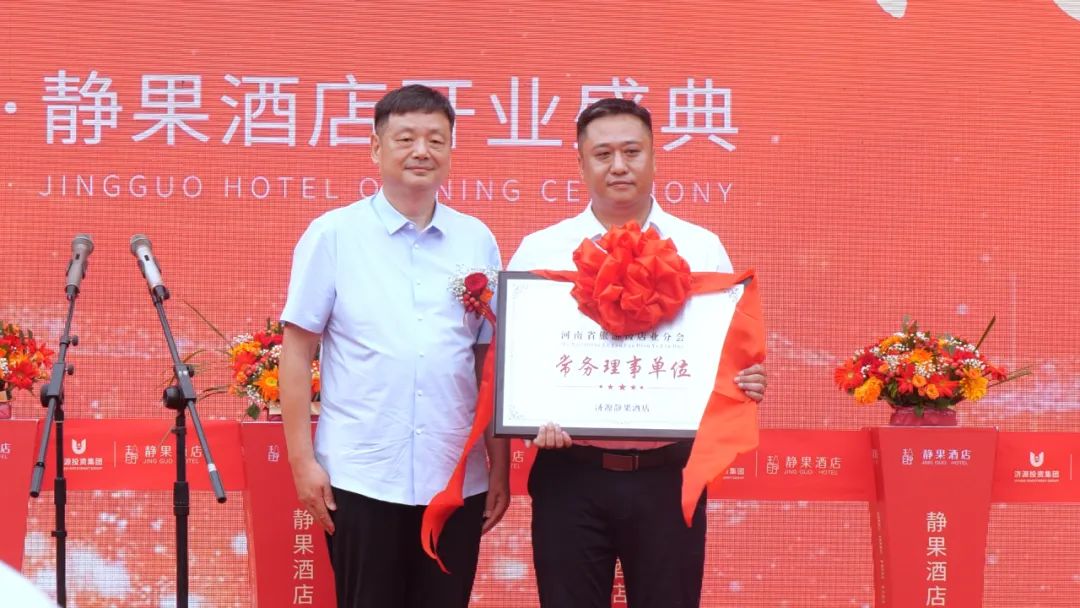 河南省旅游協(xié)會(huì)旅游飯店分會(huì)秘書(shū)長(zhǎng)朱艷峰代表協(xié)會(huì)為濟(jì)源投資集團(tuán)靜果酒店授牌。